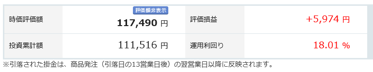 | 毎月のつみたて額 | 23,000円 (手数料を引くと22,833円) |