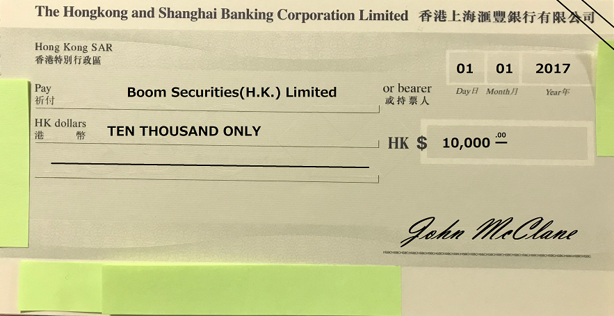 となっています。私は、HSBC香港の口座を持っているので、その小切手を同封しました。