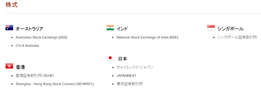 Interactive Brokersだと、グローバルアクセスといって、世界24か国の株式の取引ができますが、アジアの新興国には弱いです。