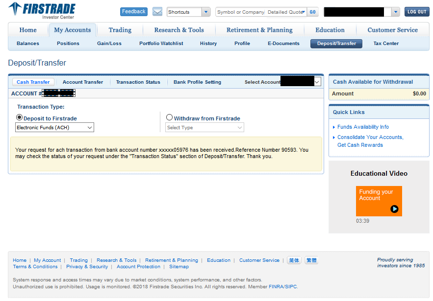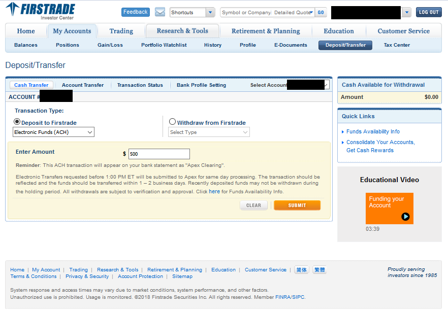 この画面で、「Deposit to Firstrade」を選択して、その下で「Electoronic Funds(ACH)」を選びます。