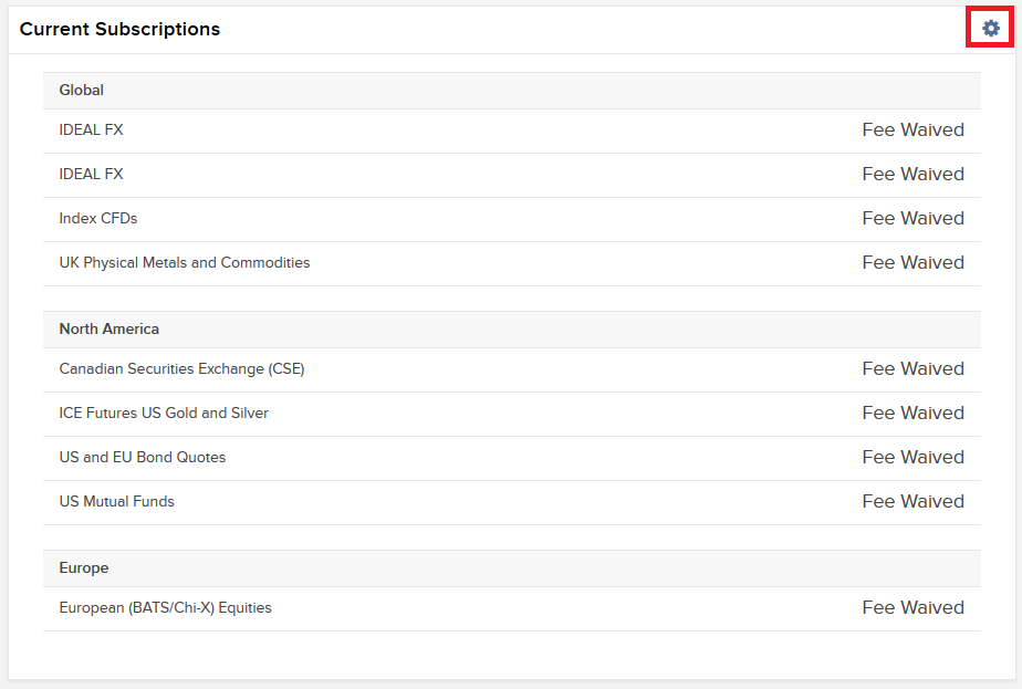 その右に表示される「Trading Platform」の中に「Market Data Subscriptions」があります。その右の設定マークをクリック。