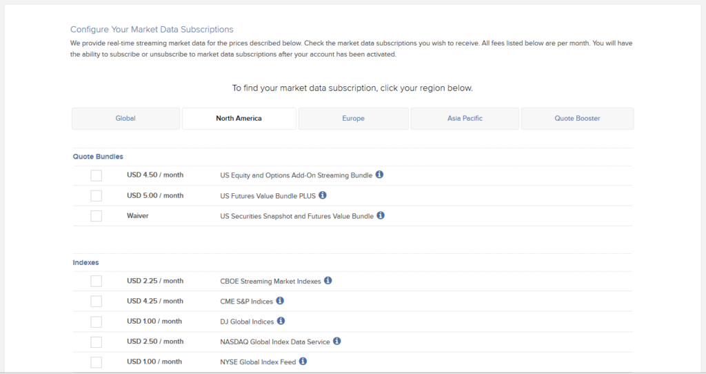 Interactive Brokersでは、マーケット情報(リアルタイム株価表示など)が取引所毎に手数料がかかります。