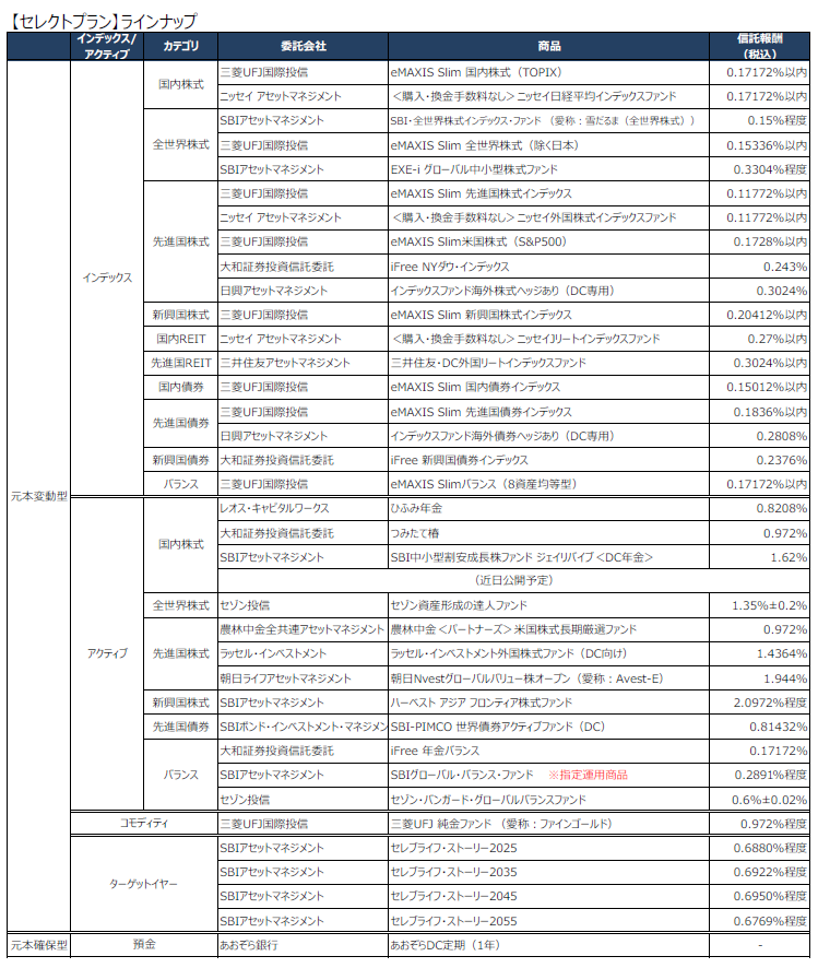 セレクトプランは、全体的に信託報酬の少ない商品がそろっています。